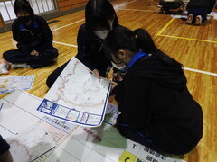 グループワークでは、まずハザードマップを見て、自宅の場所、自宅の区域、避難場所等を確認しました。web上の「キキクル」や「かさねるハザードマップ」も参考にできます。