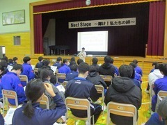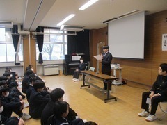 校長からは教育目標にも入っている「寛容」についての講話がありました。地域の寛容性とその地域に将来戻ってくることには関わりがあることをグラフを見ながら考えました。少し難しい内容でしたが、生徒たちは真剣に話を聞き、考えていました。